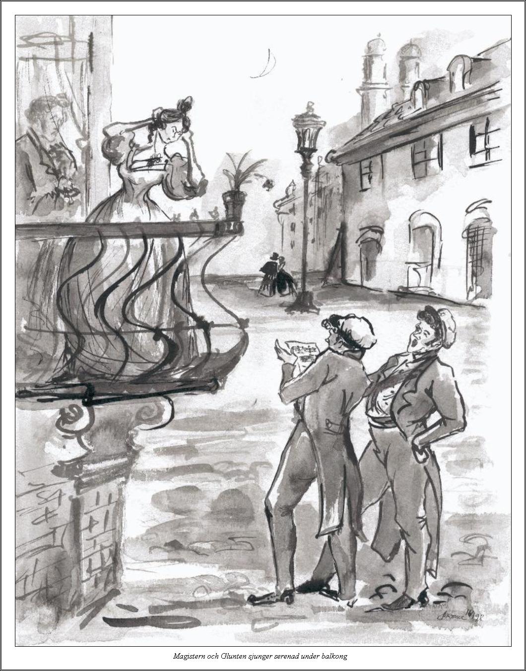 Magistern och Glunten sjunger serenad. Teckning av Marta Ronne.