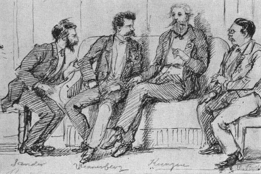 Gunnar Wennerberg, Fredrik Sander, Kung Oscar II och Viktor Rydberg. Teckning av Fritz von Dardel.