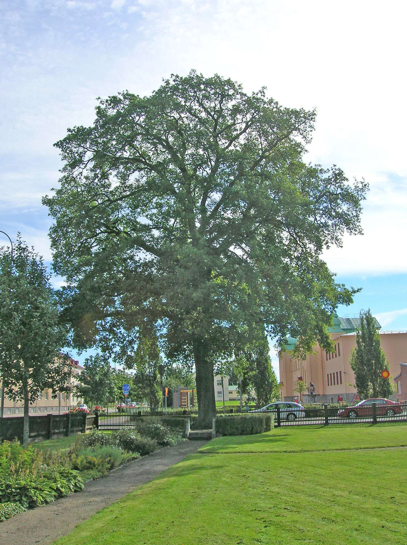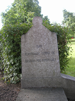 Två stenar med inskription påminner om ekens historia. Trädet är bevarandeskyddat genom Q-märkning.