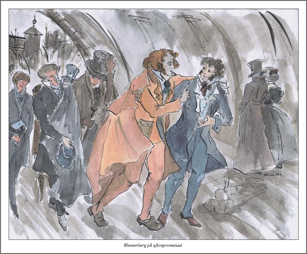 Wennerberg på aftonpromenad i Uppsala i glada vänners lag. Teckning av Marta Ronne.